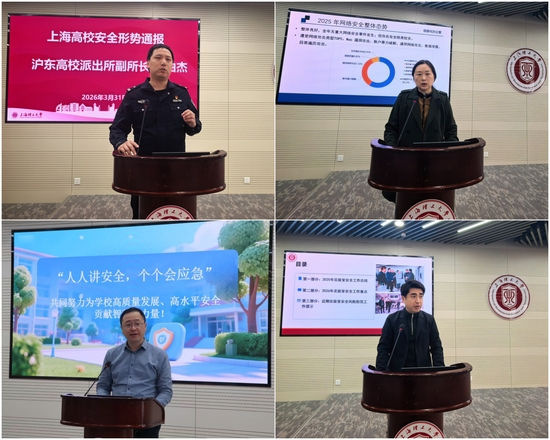 会上,沪东高校派出所副所长宣伯杰作上海高校安全形势通报。他深入剖析了当前高校安全工作五个方面的突出问题与防范要点,为学校精准开展安全防范工作提供了专业指导,并表示进一步深化警校共建,合力织密校园安全防护网。在工作部署环节,信息化办公室、资产设备与实验室管理处、保卫部(处)负责人分别围绕2026年度网络与信息安全、实验室安全、宿舍消防安全与防范电信网络诈骗等重点工作作出具体部署,对照市教委工作要求,结合学校实际明确了我校各安全领域工作目标、实施路径与责任要求,为全校全年安全工作开展划定重点、明晰方向。